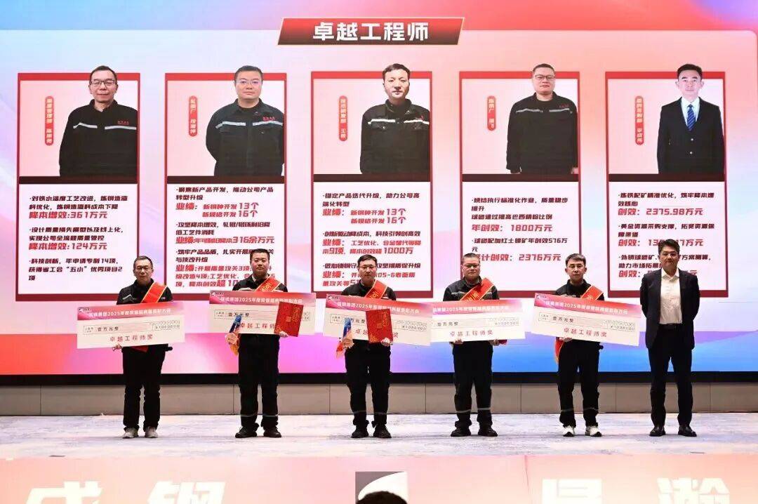 卓越骨干奖:刘洋、冯笑、宋刚、田坤明、葛长峰,他们在管理岗位上,分别有力推动或深度参与了组织与研究院重组、资源外卖与财务测算、国家级资质与资金申报、发电系统优化与气体外销、吨钢成本节约与修旧利废等重点管理或创效项目。